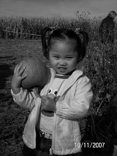 But today was absolutely beautiful!!! We took Grandma Jordahl with us and had a great time. Hayleigh wasn't very picky when choosing her pumpkin - as soon as she stepped off the hay ride, she picked the first little pumpkin and was back on the tractor again:) Then we went through the hay bale maze, climbed the hay bale pyramid and visited the farm animals. We were there with her preschool classes.
